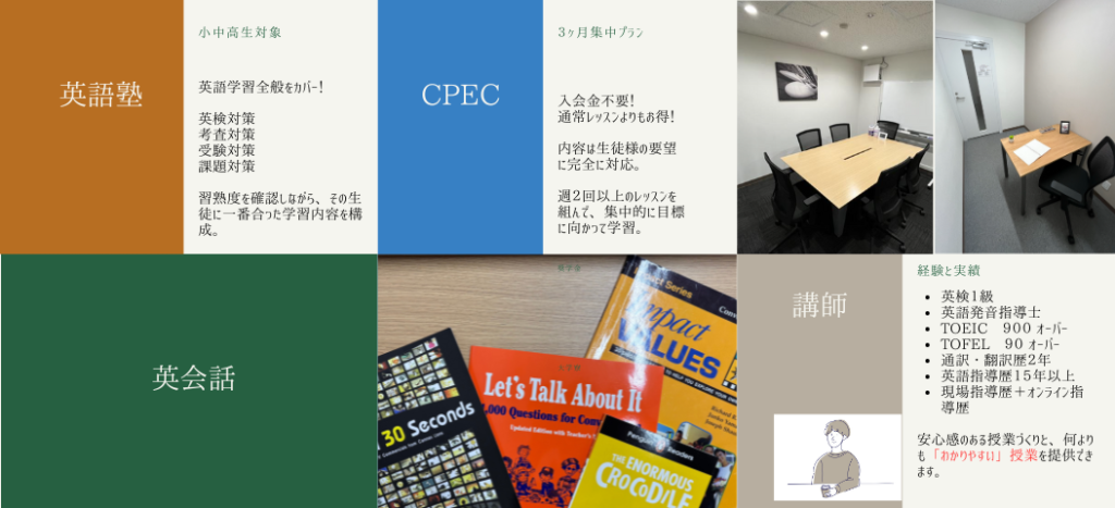 「CPEC」は「シエールパーソナル英語コーチング」の略で、3ヶ月の集中プランでお得に集中的に英語学習ができます。対象は高校生以上で、英語資格の直前対策などにも役立ちますし、受験時期直前3ヶ月に苦手分野を克服できるように授業を構築することも可能です。