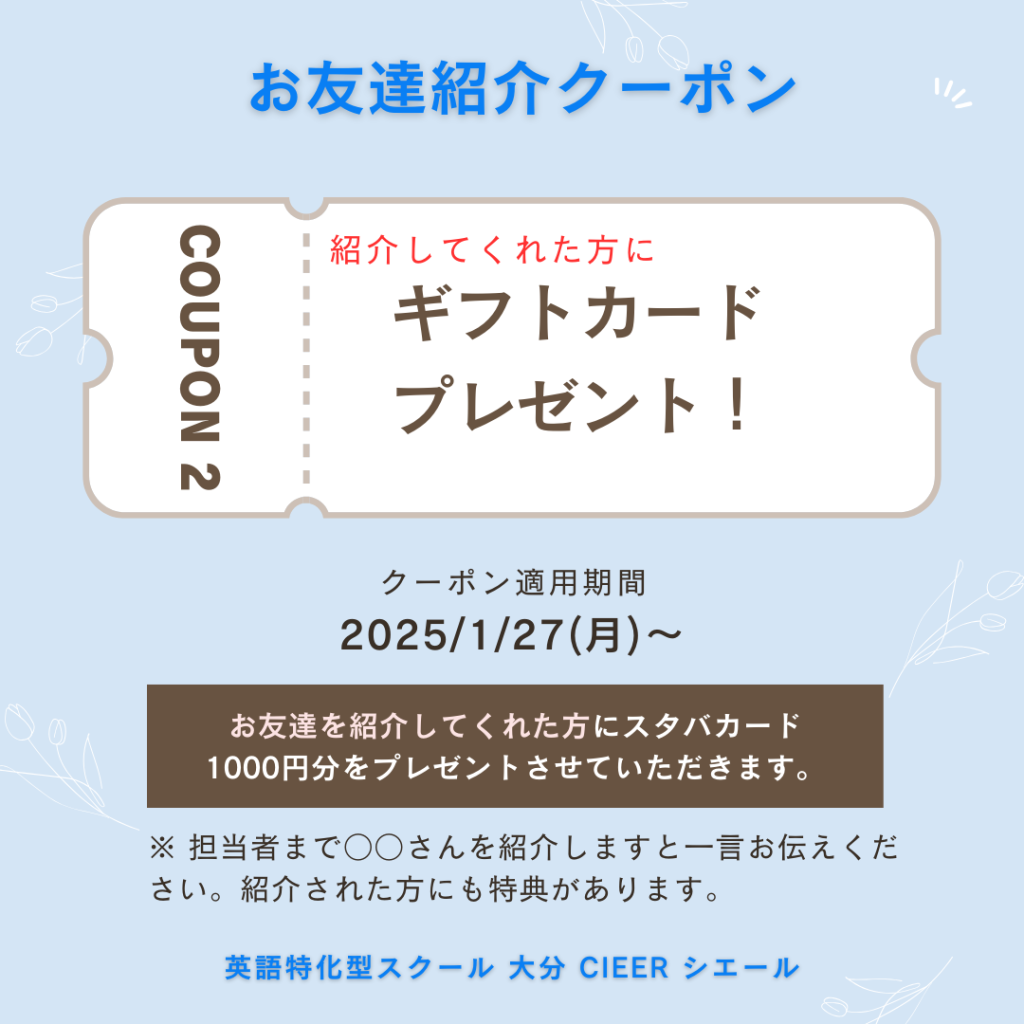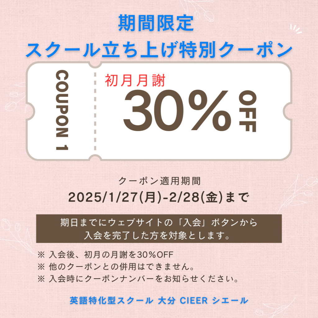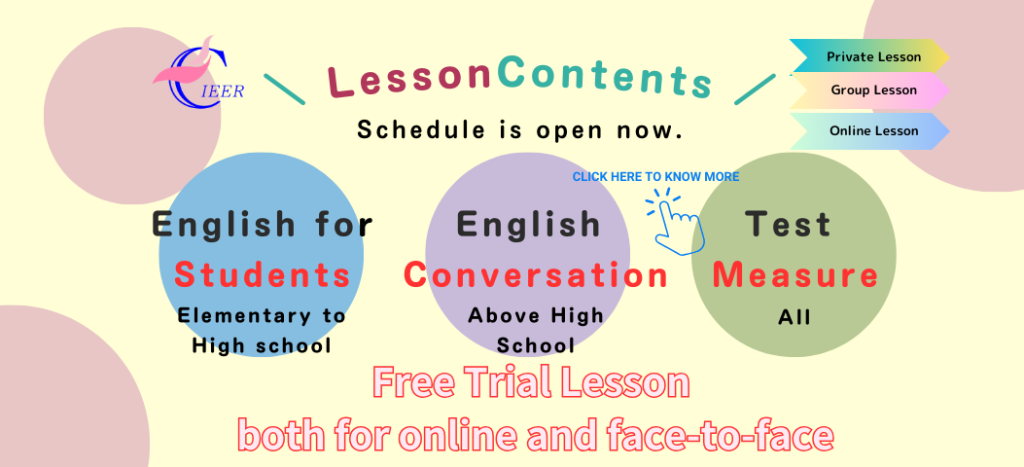 This is “English Specified School, OITA CIEER”. It aims at giving advice to all the generations studying English from elementary school students to adult learners of the language. Although this school has just launched recently, we are hoping to help as many English learners as possible to make your dreams come true.